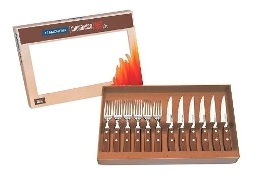 Cooking Store El asador siempre es el último que se sienta a la mesa. Pero para garantizar que los invitados también traten al asado con respeto, nada mejor que elegir los cubiertos adecuados para eso. La línea Churrasco de Tramontina tiene mangos de madera que resisten a la intemperie y a la humedad y láminas de acero inoxidable para garantizar el corte perfecto de las carnes. - Articulo 22299 - Láminas de acero inoxidable. - Mangos de madera. - Remaches de aluminio. • 6 TENEDORES: Hojas de acero inoxidable y mangos madera pre fijados con remaches de aluminio. • 6 CUCHILLOS: Hojas de acero inoxidable filo con sierra y mangos madera pre fijados con remaches de aluminio.